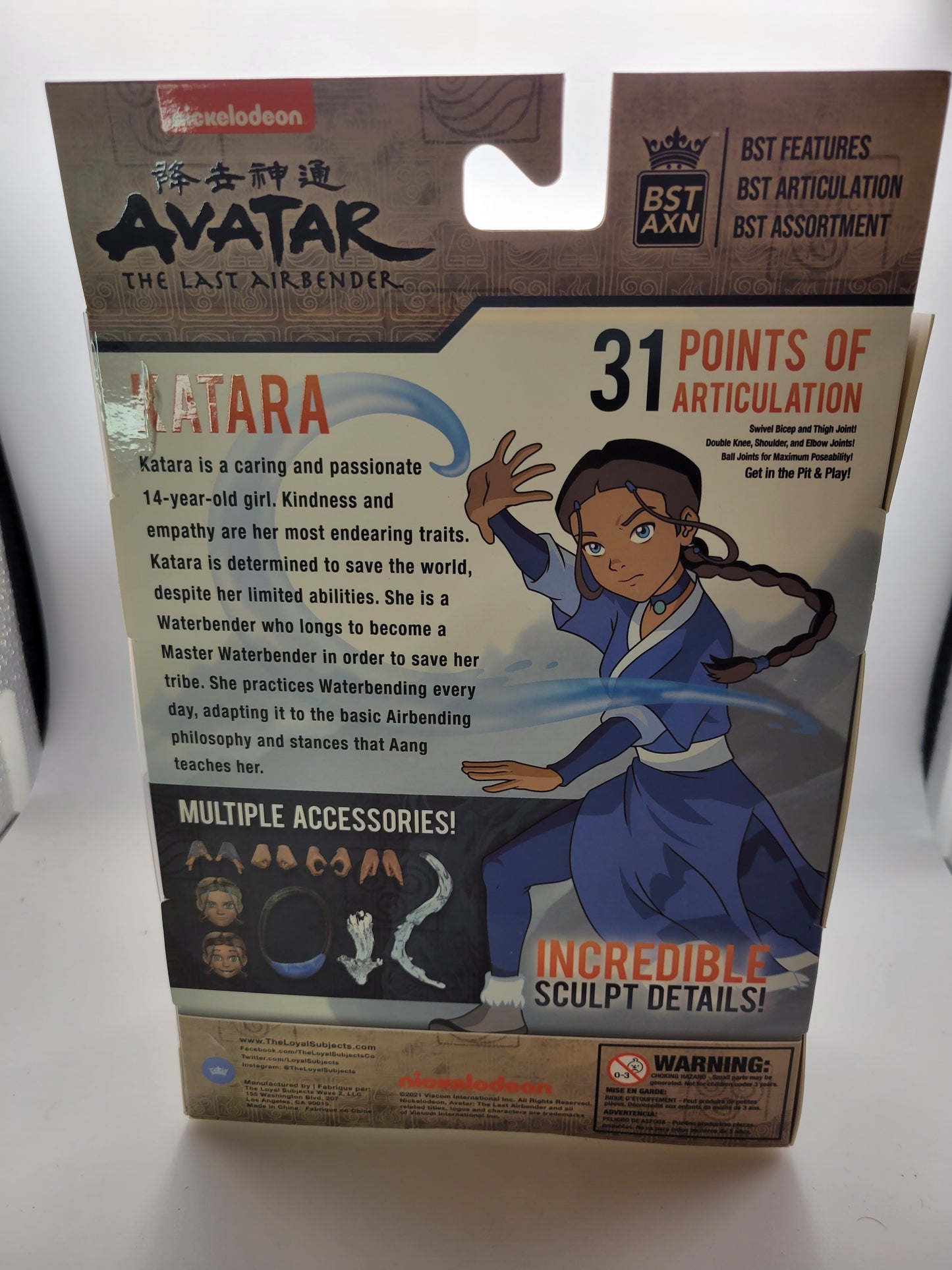 The packaging features Avatar: The Last Airbender branding with images of Katara and the show's iconic design, making it a great item for both display and play for fans of the series.