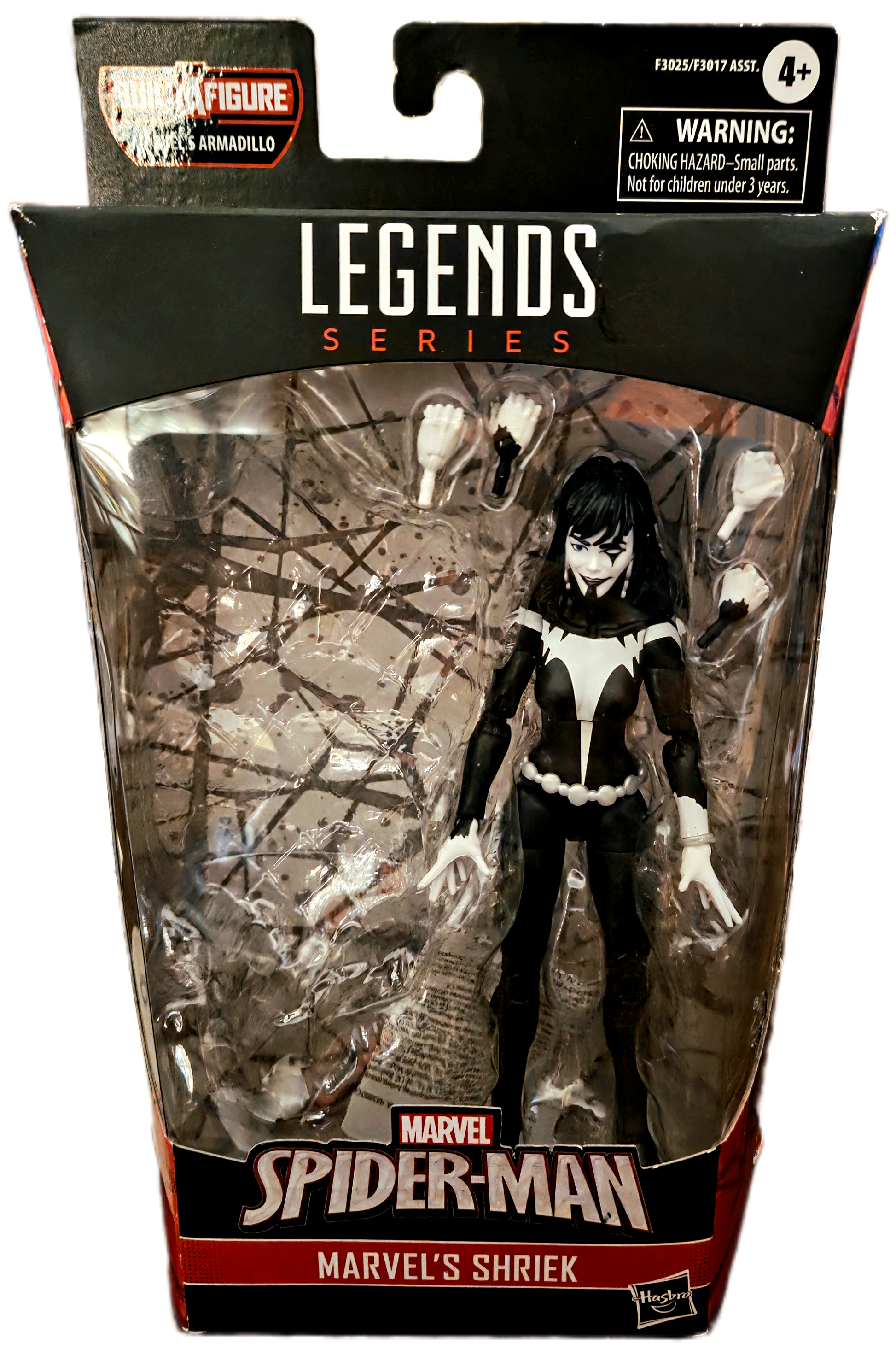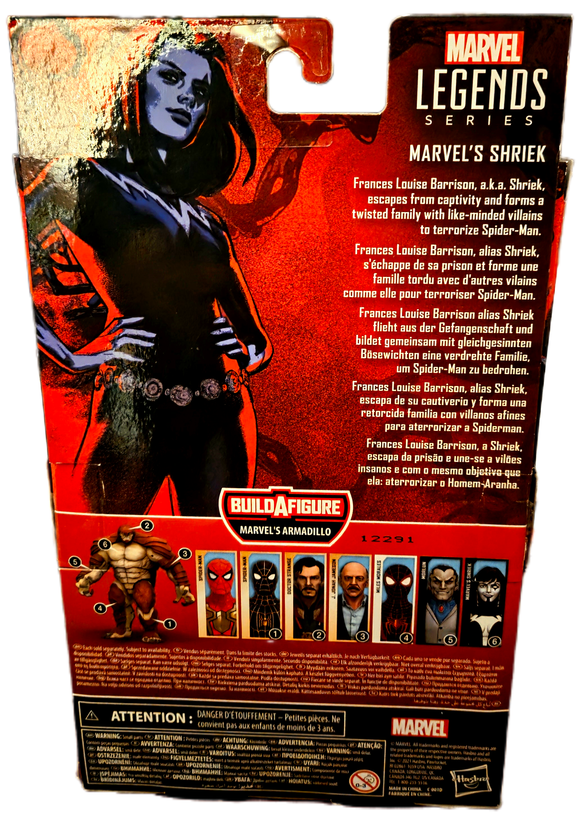 The Hasbro Marvel Legends Spider-Man Shriek (Armadillo Wave) Action Figure (No BAF Piece) is a 6-inch scale collectible figure that brings the iconic Spider-Man villain Frances Louise Barrison, also known as Shriek, to life. This particular listing indicates that the figure does not include the Build-A-Figure (BAF) piece for Armadillo.