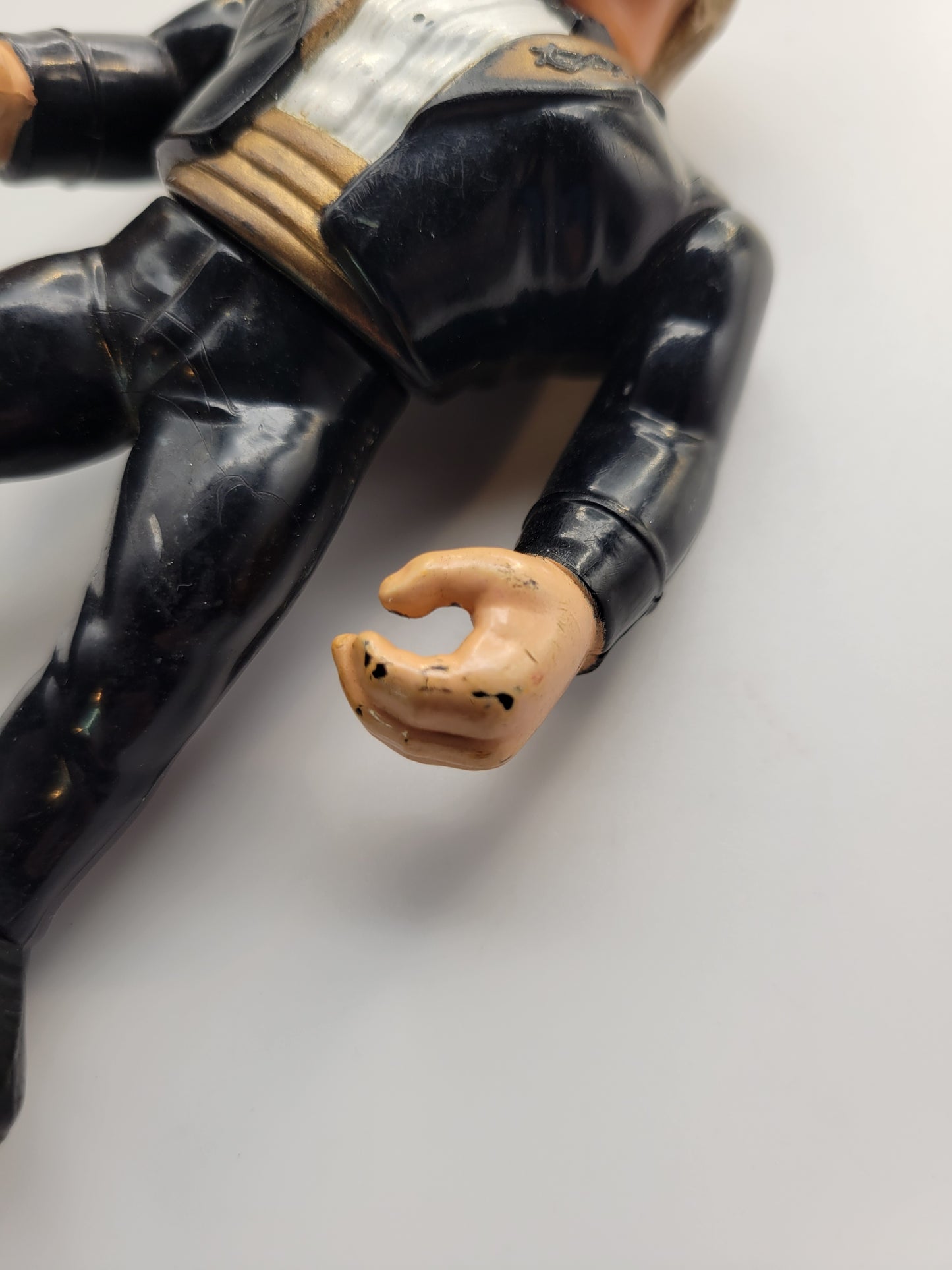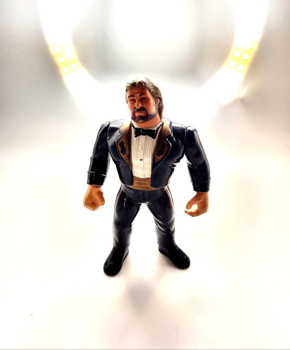 The figure typically has an action feature called the "Million Dollar Punch," which allows it to perform a spring-loaded arm movement simulating a striking motion. With a defined facial expression showcasing DiBiase's trademark smirk, this figure is a favorite among vintage wrestling toy collectors.