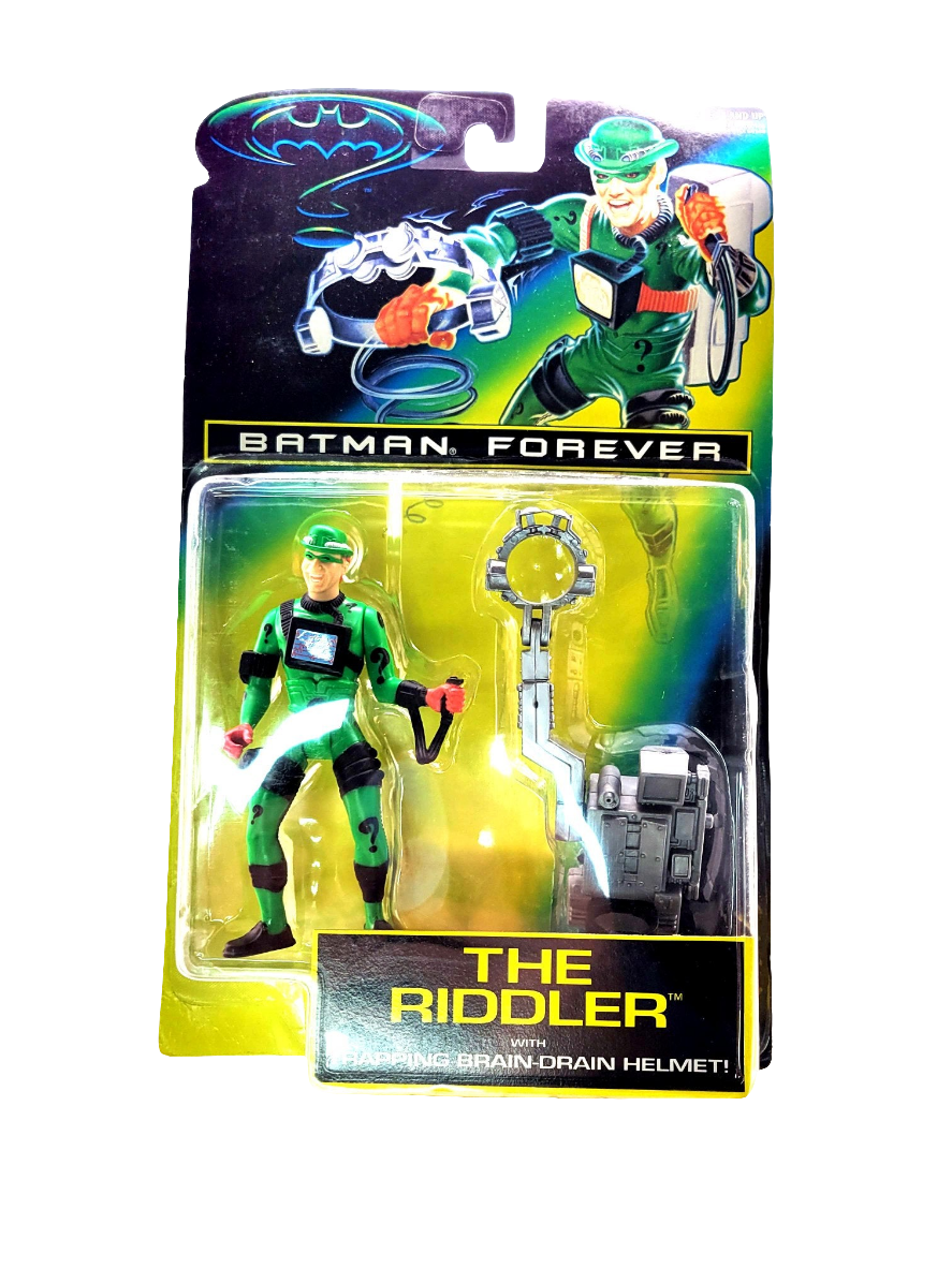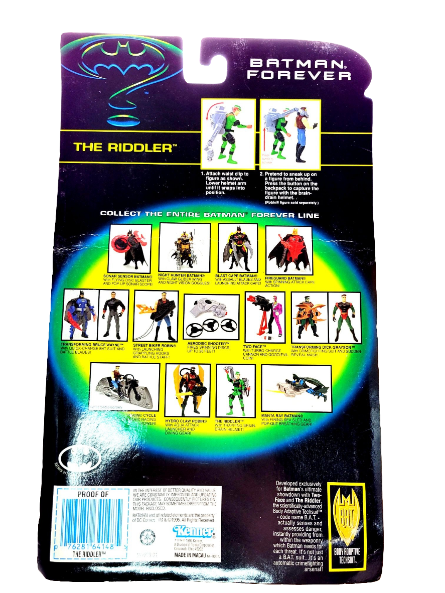 Packaged in classic Batman Forever blister card packaging, with bold, movie-themed graphics, this figure is a collectible for fans of the 1990s Batman films and The Riddler’s colorful character.