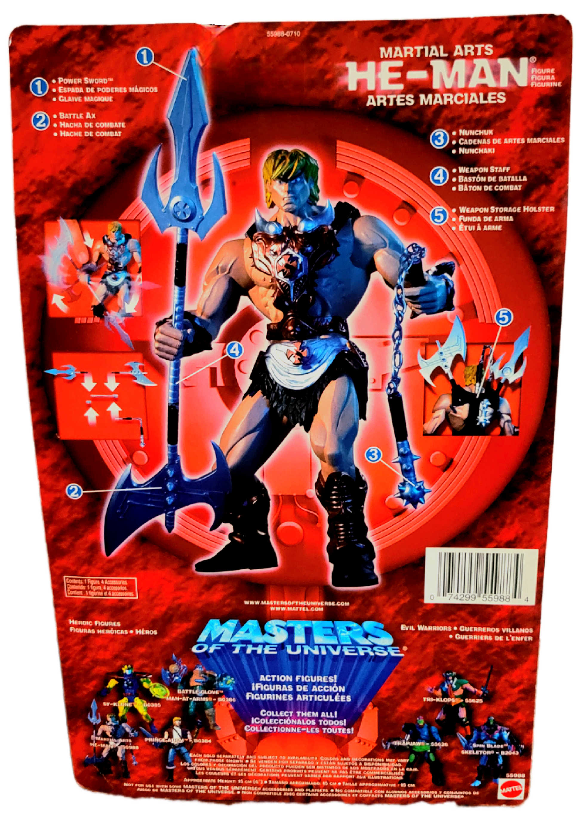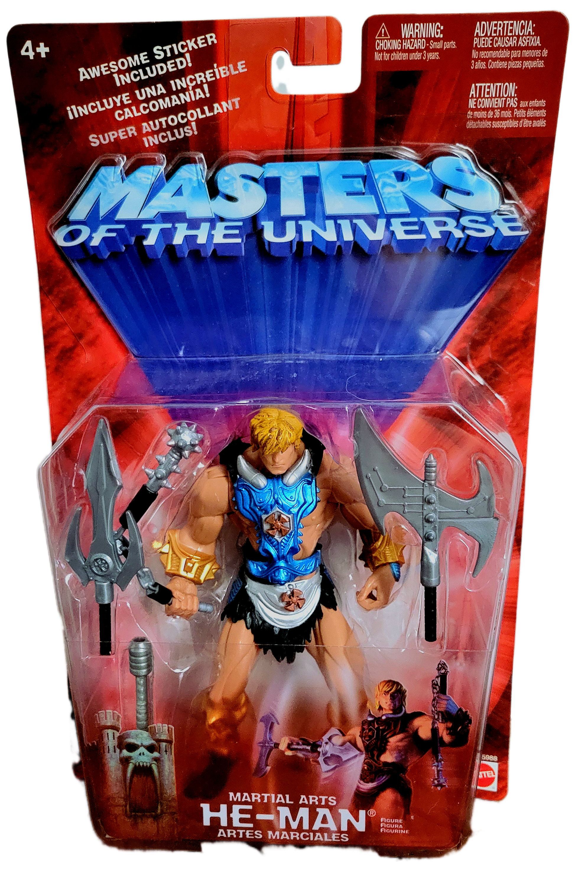 The Martial Arts He-Man action figure, released by Mattel in 2003 as part of the Masters of the Universe 200x series, stands approximately 6 inches tall. This figure is equipped with a variety of weapons, including a Power Sword, battle axe, nunchaku, and a weapon staff. Additionally, it features a weapon storage holder for convenient accessory management.