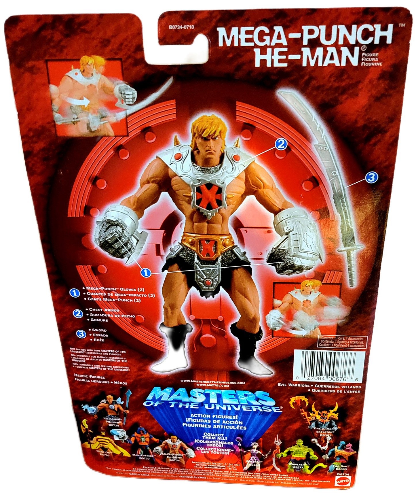 * "Mega Punch" Action Feature: This is the defining gimmick of the figure. Mega Punch He-Man is outfitted with oversized red and silver mechanical gauntlets or armored fists. The action feature is typically a spring-loaded twisting "mega punch" mechanism. By winding or activating a trigger on the figure's back or side, his arm (or sometimes both arms) would swing forward with a powerful "punching" motion, simulating enhanced combat strength. This feature is integrated directly into his design, making the gauntlets a prominent visual element.