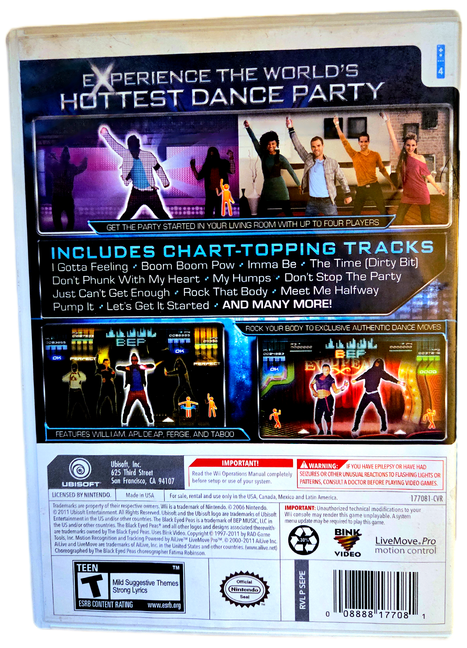 Gameplay: Players follow on-screen dance routines, mimicking the choreography shown by digitized members of The Black Eyed Peas (will.i.am, Fergie, apl.de.ap, and Taboo). The Wii Remote's motion-sensing capabilities are used to register the player's movements.