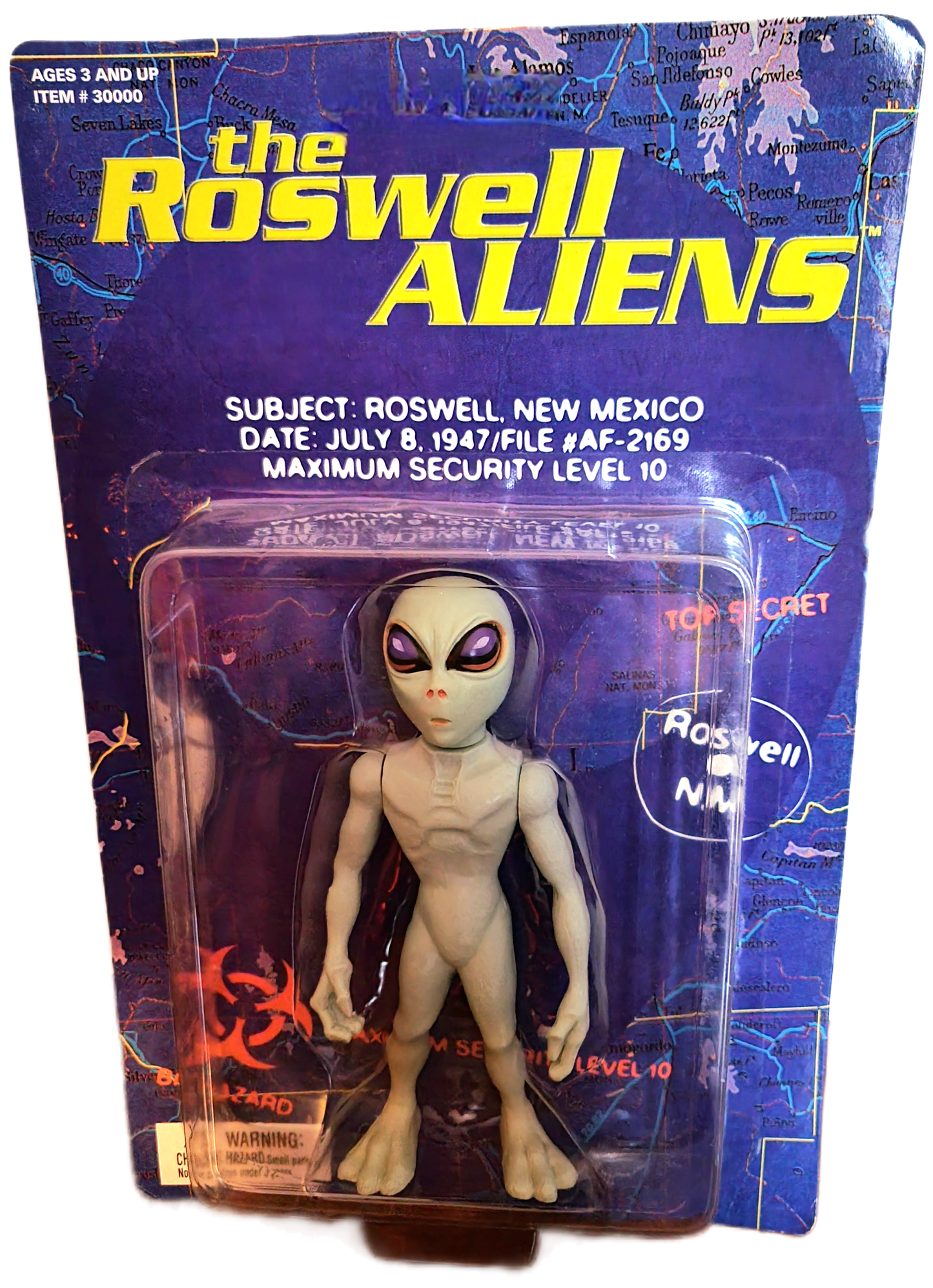 * Packaging: The figures were released on blister cards, often featuring graphics related to the Roswell incident, UFOs, and outer space. The packaging itself is often a collectible aspect for these vintage figures.